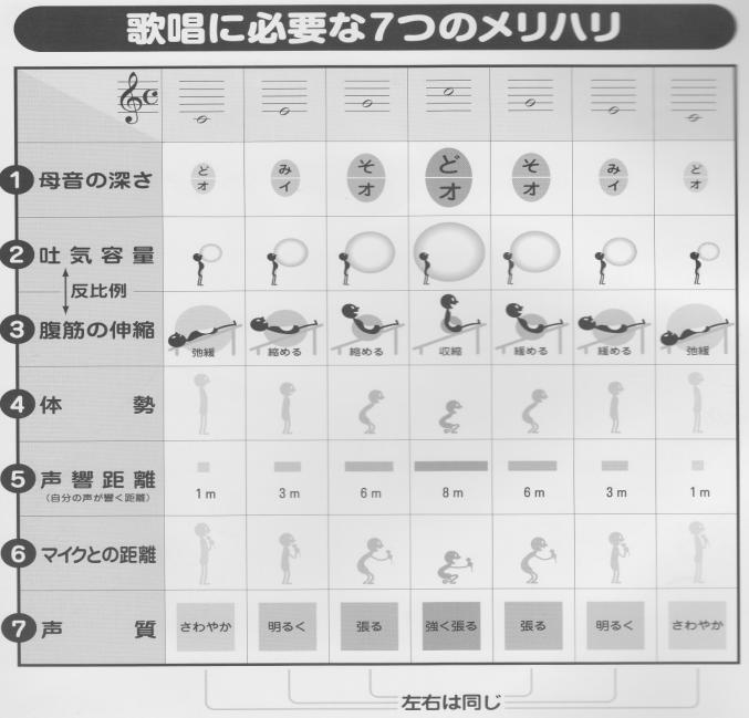 腹式による呼吸と発声、腹筋の弛緩収縮、母音の基礎発声、響く発声などイラスト付きで解説